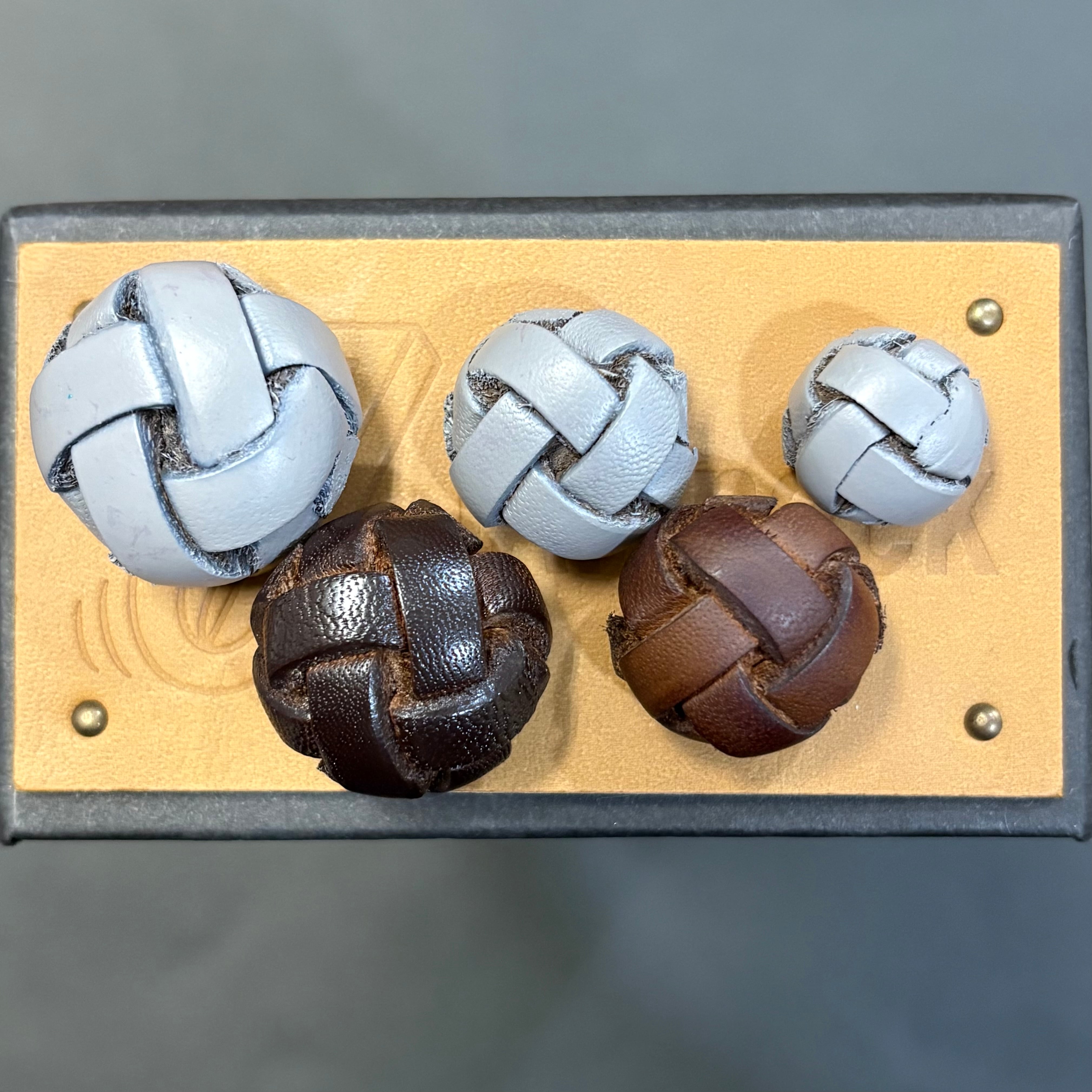 バスケット型の裏足つき本革ボタンです。